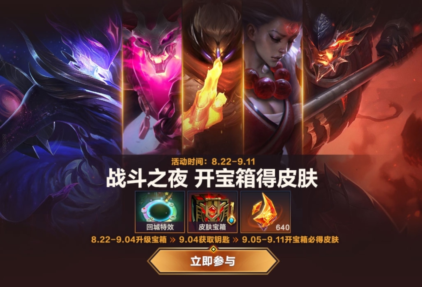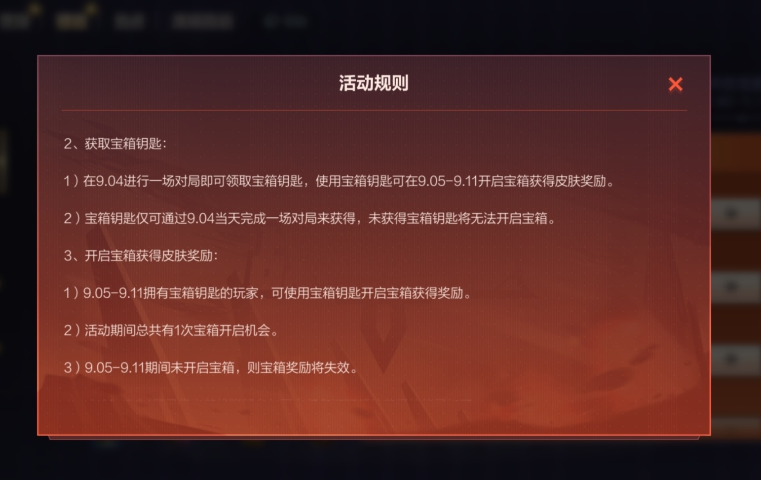 PS:最重要的是9月4日当天必须打一把游戏才能领到钥匙用来开箱子。如果没有钥匙,即使打到钻石宝箱也开不了。