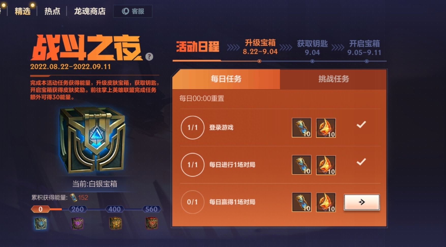 英雄联盟手游的战斗之夜活动和庆典也已经开始了,和端游一样也是通过完成任务来升级箱子,最高可白嫖到钻石宝箱,钻石宝箱里都是史诗皮肤,而且任务做起来还是比较简单的。基本每天刷刷人机和首胜就能达到钻石宝箱的积分了。
