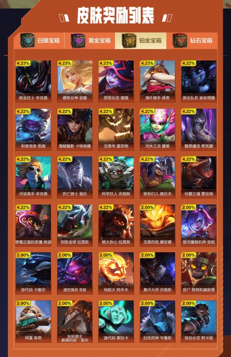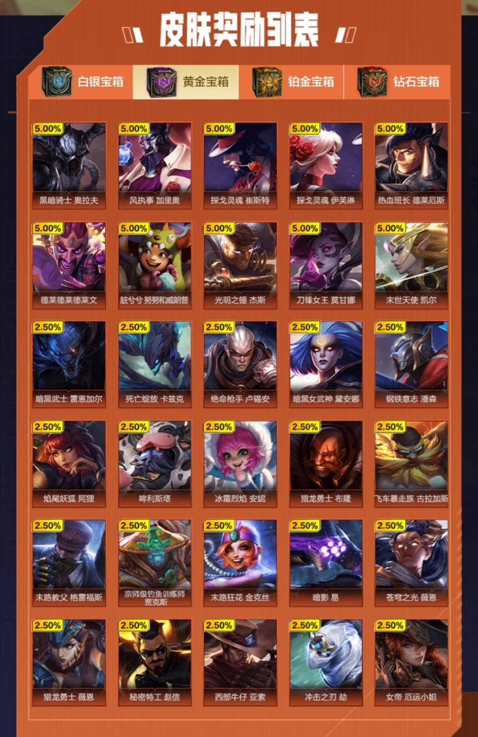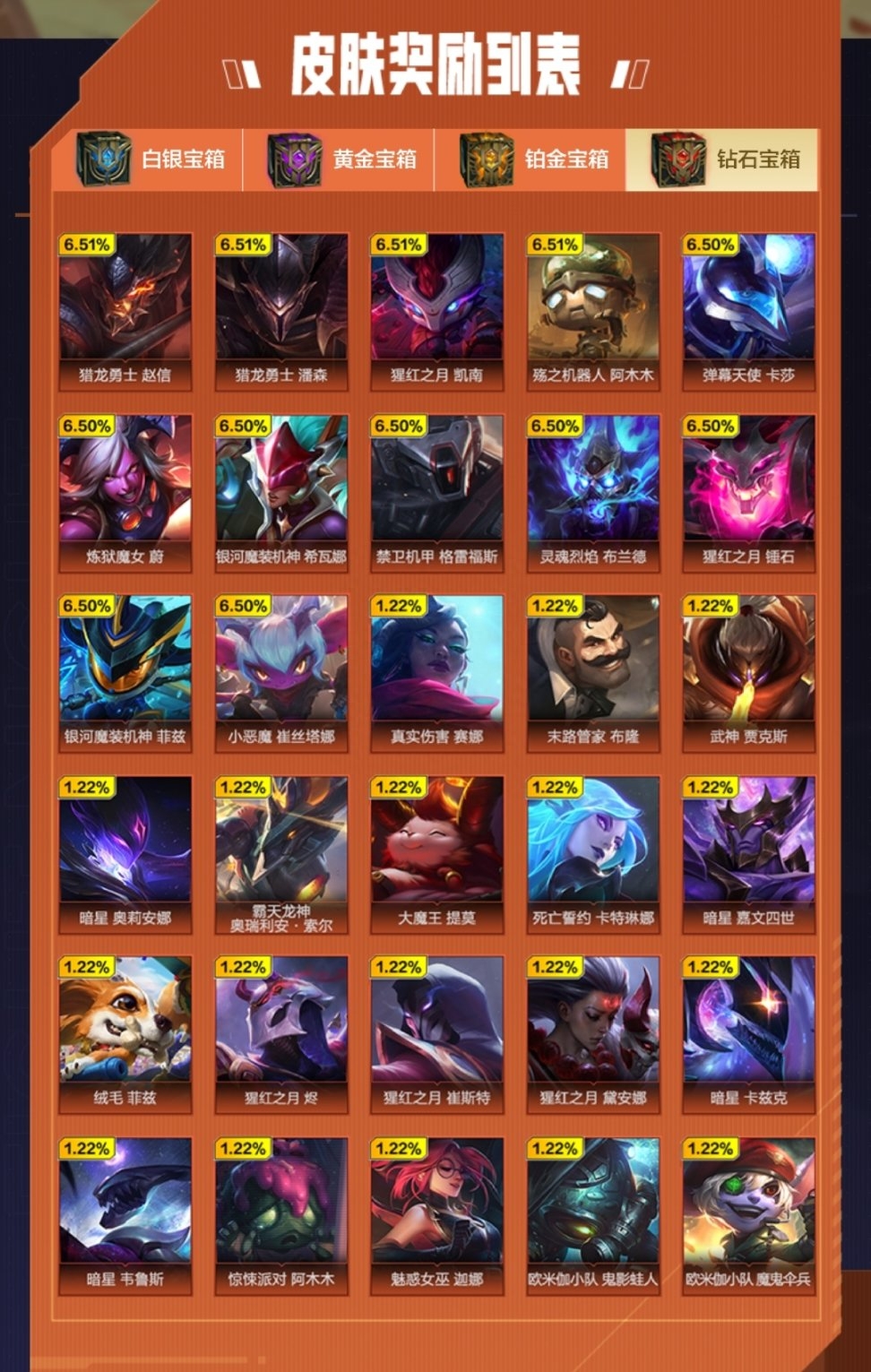 ?总共四个等级,可以参考下自己的皮肤还有哪些没有再选择开哪个宝箱。