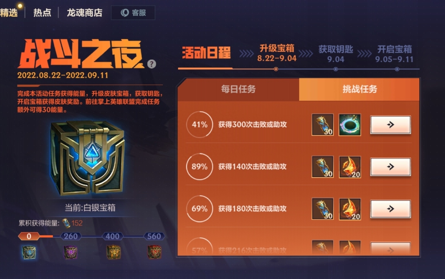挑战任务全都是击败助攻的任务,最多478次击败助攻,累计可获得380积分。基本刷刷人机很快就打完了,我今天都有看到4多分的了。而且钻石宝箱只要560分就能拿到,也就是说只要打满6天首胜和挑战任务就够了。即使到最后不够也可以做下登录掌上英雄联盟和其他平台的任务。