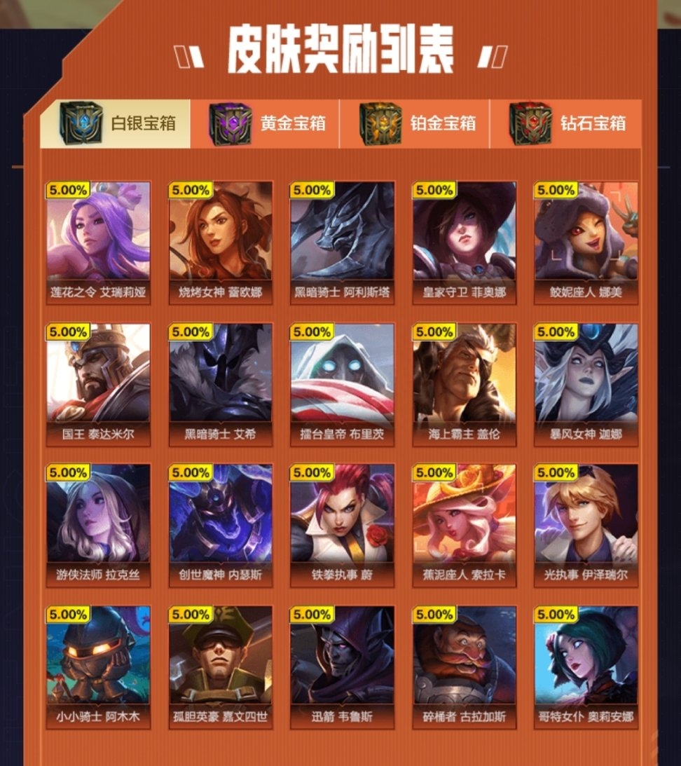 690点券加790点券档次,?虽然有史诗皮肤但并没有新皮肤。主要还是看自己喜欢的皮肤在哪个宝箱再去赌一下。