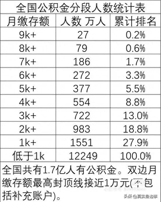 全国公积金分段人数统计表,月缴存额4,已经超过了全国90%的人。