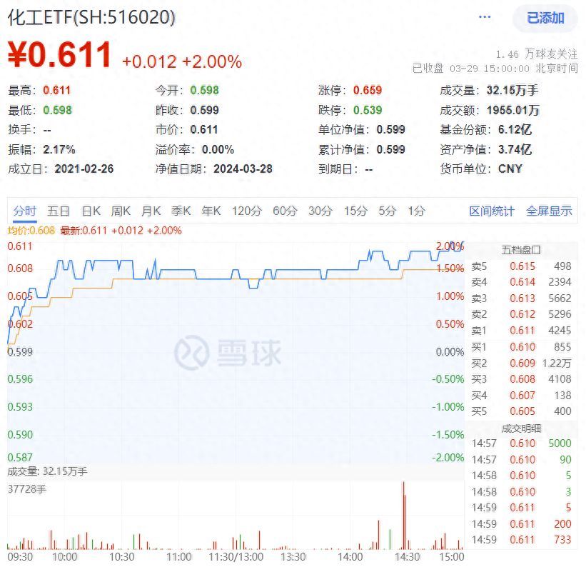 今日(2024年3月29日),化工板块开盘后直线上攻,而后全天高企。反映板块整体走势的化工ETF(516020)接连收复5日线、10日线、20日线、半年线等4根均线,截至收盘,场内价格大涨2%,连续两日上涨。