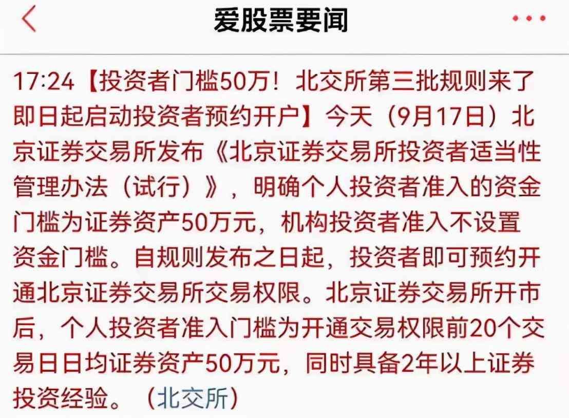 9月17日,北交所发布了关于投资者门槛调整的最新政策。政策显示,个人投资者准入的资金门槛为证券资产50万元,并且对机构投资者准入不设置投资门槛。除此之外,创新层投资者的准入资金要求也降低了门槛,从150万元降低到1万元。