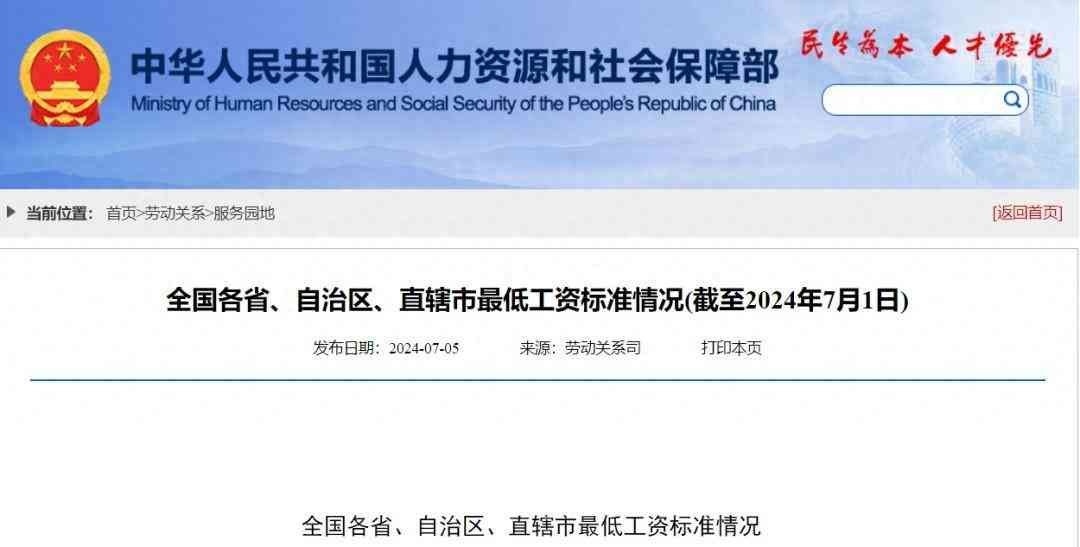 近日,人力资源社会保障部官网公布全国各省、自治区、直辖市最低工资标准情况(截至2024年7月1日)。