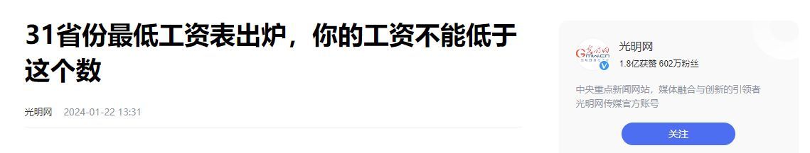信源《31省份最低工资表出炉,你的工资不能低于这个数》——光明网 2024-01-22