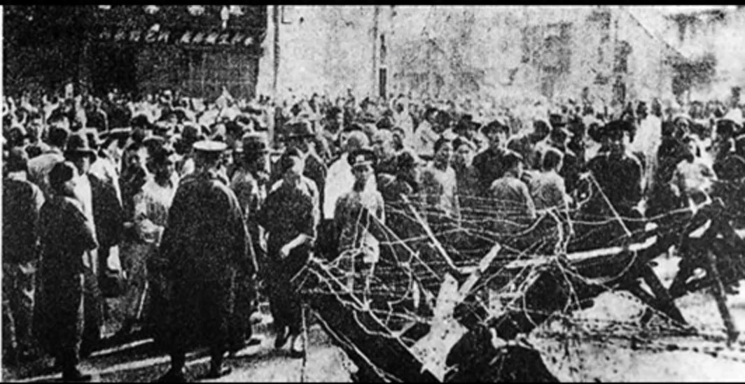 上海市民在苏州河南岸关注着四行仓库的战况。