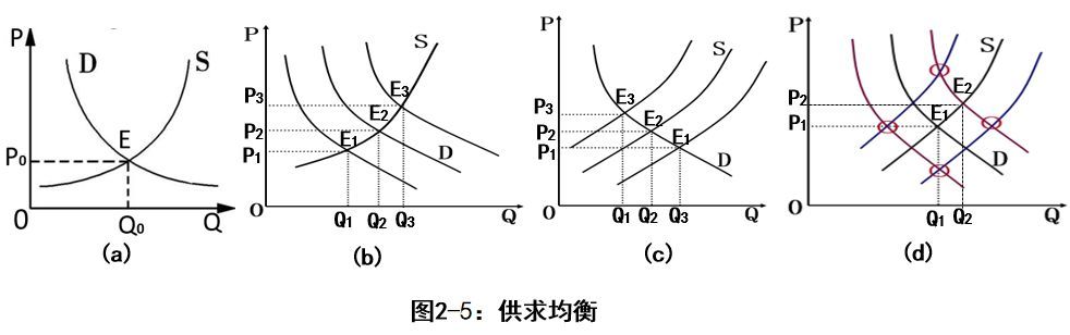 二是静态均衡与动态均衡。静态均衡指一个经济系统中所有变量都处于一种相对静止状态,即没有变化发生的状态。图2-5(a)可以看作是一种静态均衡。严格地说,它是一种特殊的均衡,即从一个时期到下一个时期均衡态势保持不变的一种情况。动态均衡指一个经济系统中各种变量随时间推移而变化时所实现的均衡状态。图2-5(b)、(c)、(d)都表现为动态均衡。它们的区别在于,图(b)是供给不变,需求变动实现的均衡;图(c)是需求不变,供给变动实现的均衡;图(d)是供给和需求同时变动实现的均衡。静态均衡是一定时点性的解析,描述一个极短时间内的均衡。动态均衡是一定时期内流量的均衡,描述各种变量从一个时期到另一个时期的运动达到的均衡。由于一切事物都处于不断变化之中,静态均衡在现实生活中并不存在,但分析静态均衡具有重大的理论意义。因为静态均衡分析是动态均衡分析的前提,静态均衡可以作为动态均衡的一种特殊情况。研究静态均衡的目的在于发现外生因素不变条件下均衡的存在条件。弄清了静态均衡的条件才能更好地研究动态经济系统。