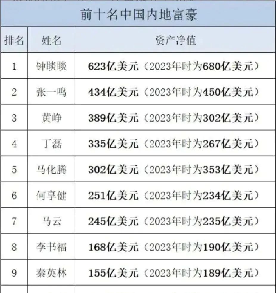 在2024年的富豪榜上,中国内地前十名富豪分别是: