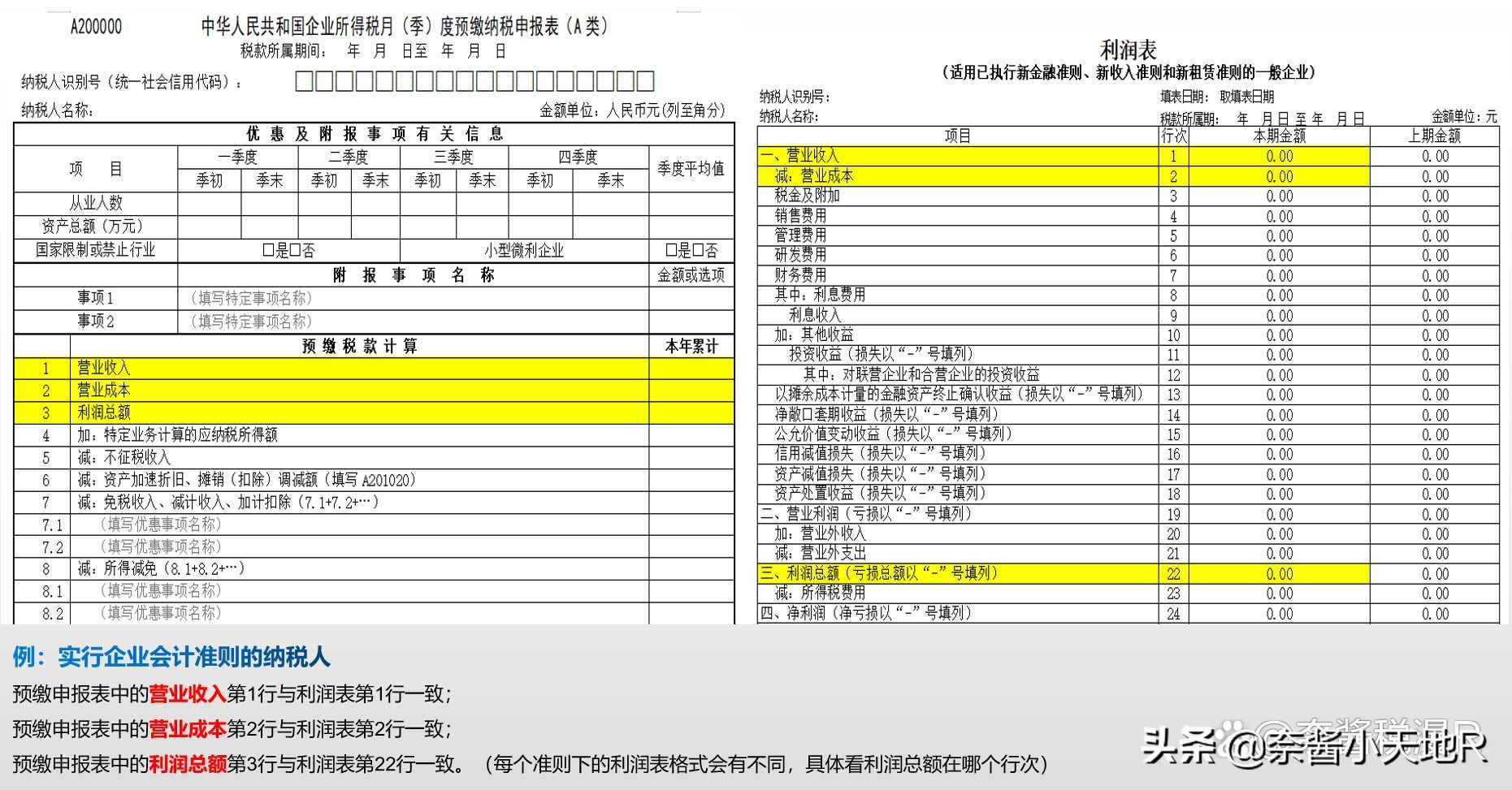 按照季度预缴申报表的填表说明,第1行“营业收入”、第2行“营业成本”和第3行“利润总额”:是填报纳税人截至本税款所属期末,按照国家统一会计制度规定核算的本年累计营业收入、营业成本和利润总额。即纳税人在会计核算正确的情况下,申报表上的营业收入、营业成本和利润总额与利润表上相关行次的本年累计数口径是一致的,可以直接从利润表上取数填写。