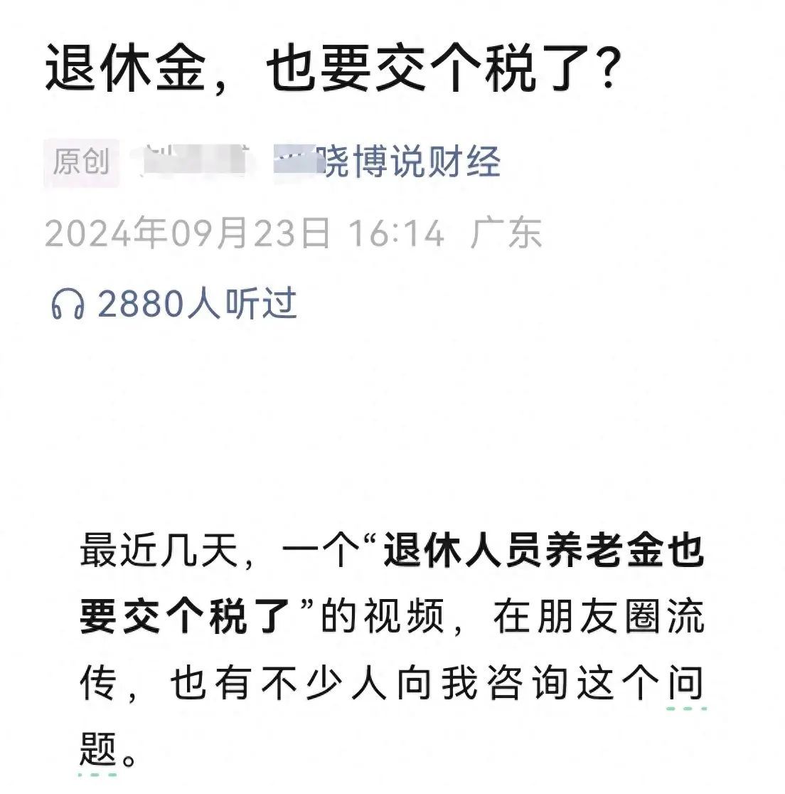 近日,有网名 “X 晓博说财经”的网络大 V,发布了一篇题为“退休金,也要交个税了?”的文章,对所谓的养老金要缴税谣言进行了分析、驳斥。