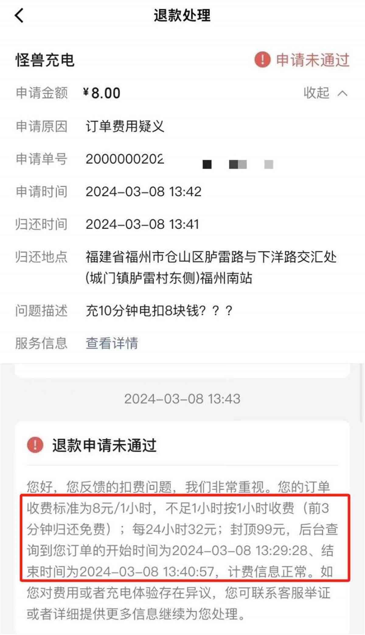 日前,有网友在社交平台上晒出一张“怪兽充电”的共享充电宝订单截图。截图显示,其订单开始时间为3月8日13:29,结束时间为当天13:40,共计11分钟,扣费金额为8元。该网友对其扣费产生质疑,并申请退款,但申请未被通过。