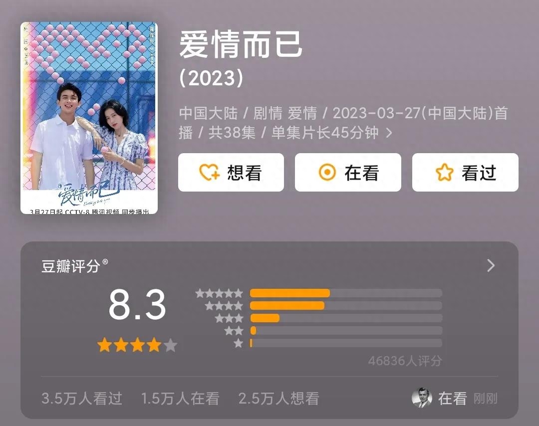 由吴磊、周雨彤主演的《爱情而已》迎来了超前点播。网友纷纷表示:请内娱男星的身材都按吴磊的标准卷起来!周雨彤的快乐不像演的!虽然网上有许多嘲讽收视率的声音,但实际就是豆瓣评分高达8.3,周围人都在追剧中。
