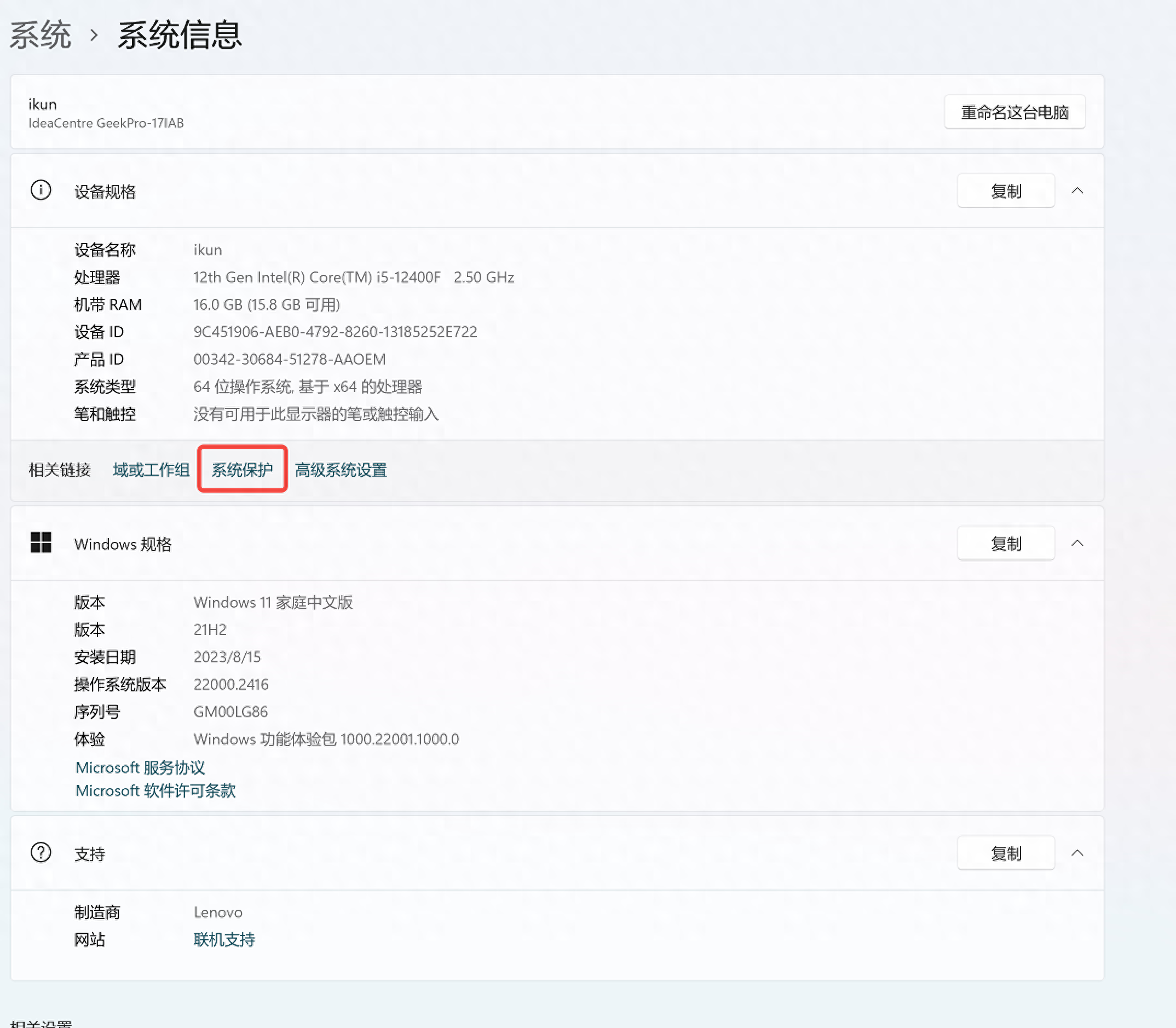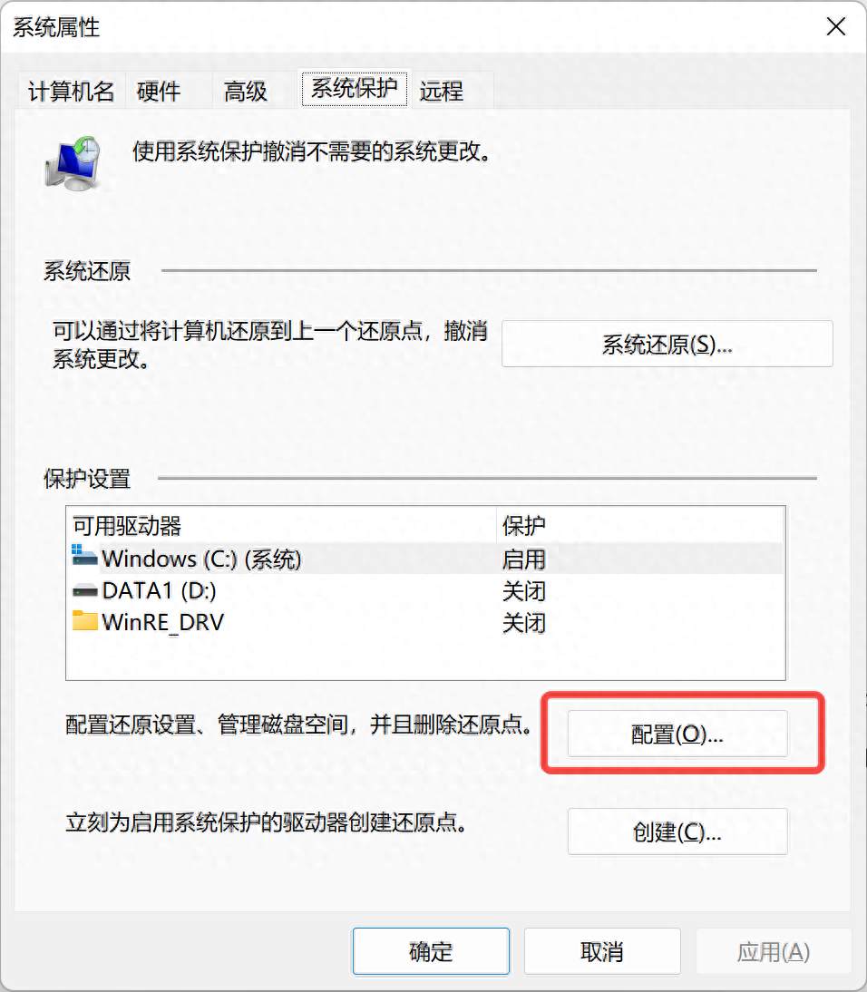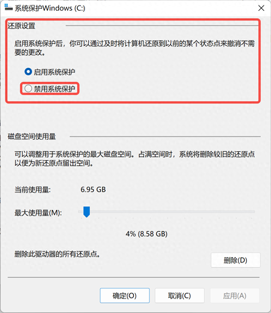 4.在这里我们可以直接点击禁用系统保护,关闭系统还原功能,并删除系统还原的文件,但是如果你的C盘空间还很足,我们也可以考虑保留系统还原功能和它的文件,因为关键的时刻可以利用系统还原来找回重要数据。