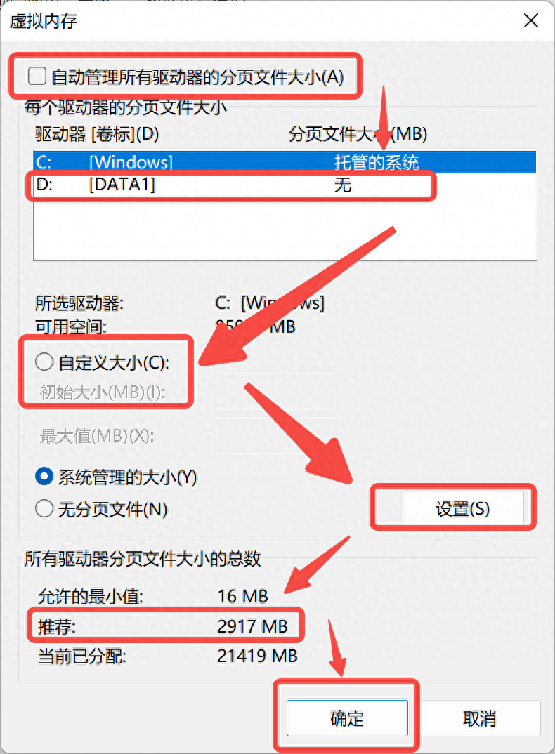 5.首先取消勾选自动管理所有驱动器的分页文件大小,接着勾选任意一个除C盘以外的磁盘,然后点击自定义打下,下方有系统推荐的数值,最后点击设置,然后确定即可。