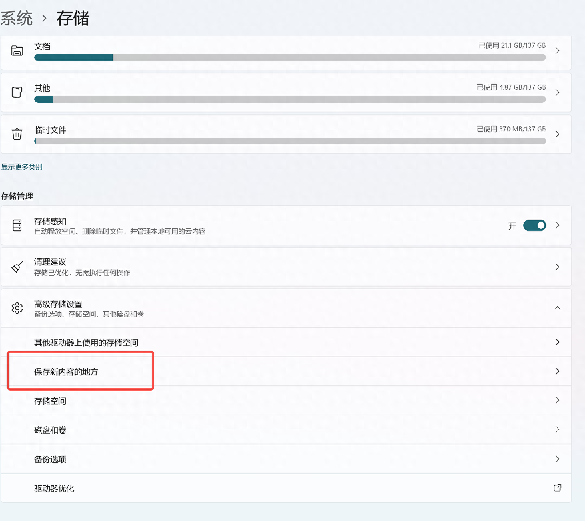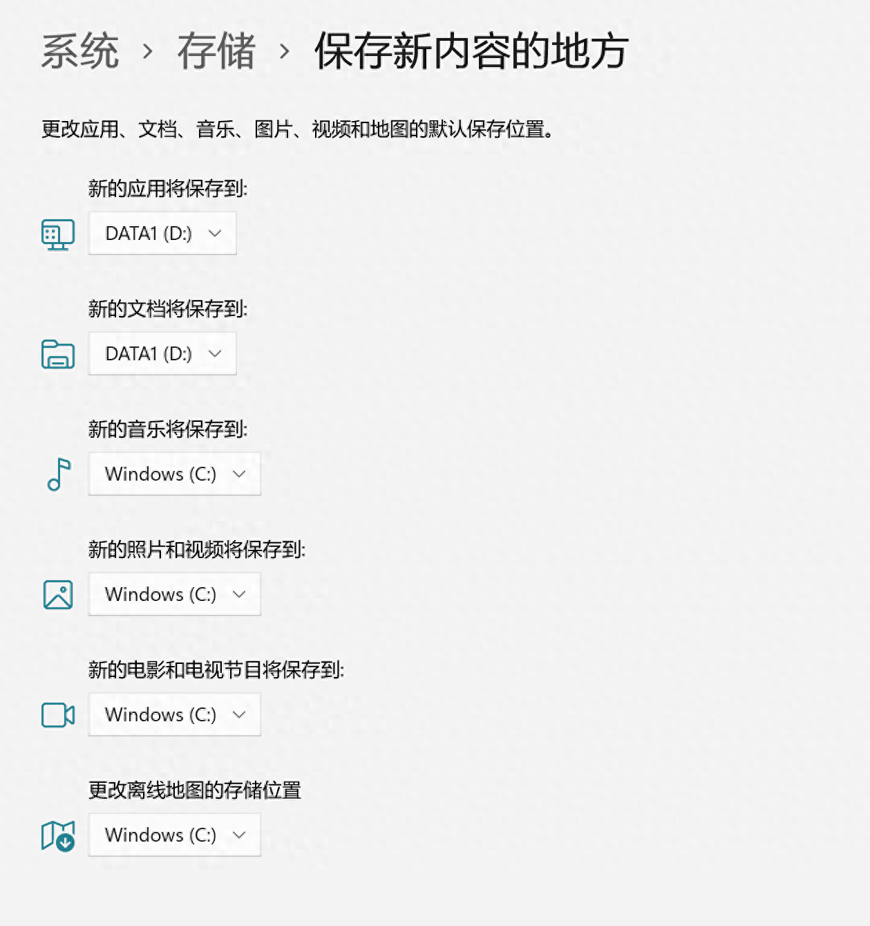 我们打开更改新内容的保存位置,将它们统统修改至其他盘,从而减少C盘的负担。