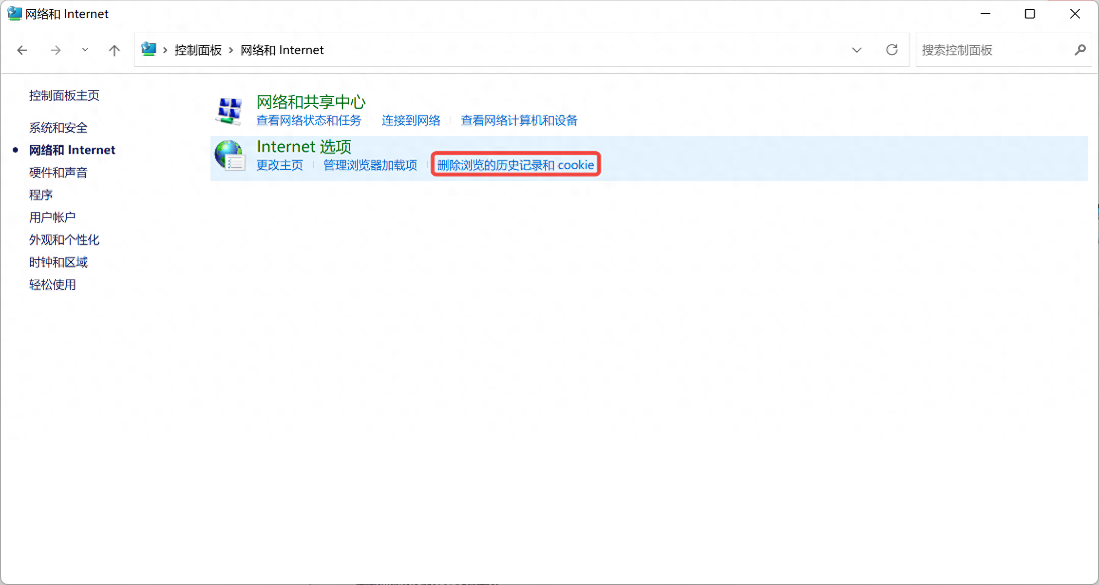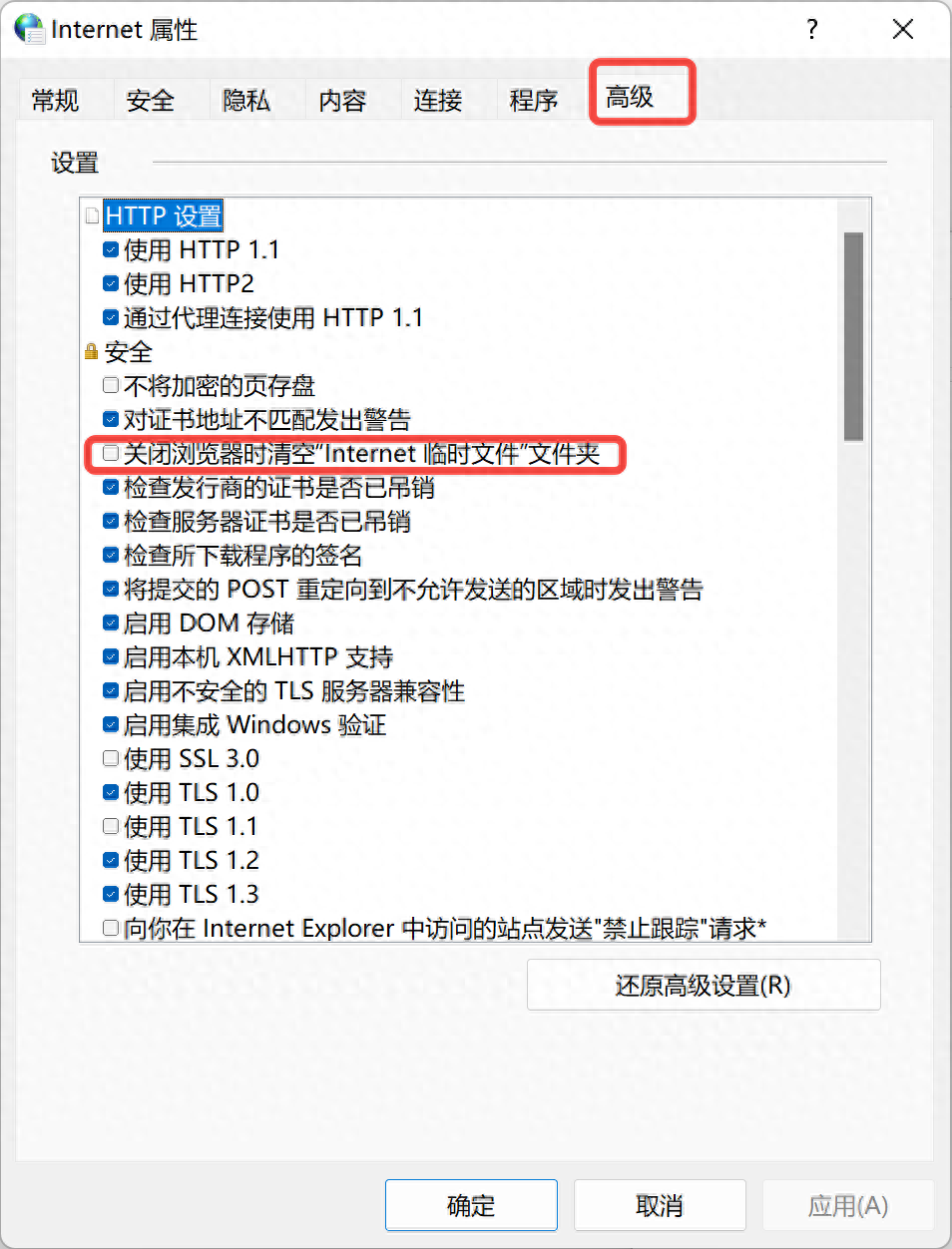 2.点击删除浏览的历史记录和 cookie,在弹出的窗口中,点击高级,选择“关闭浏览器时清空”Internet 临时文件”文件夹