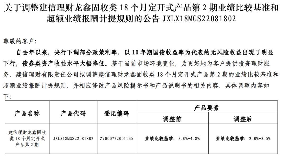 建信理财在调整公告中表示,自去年以来,央行下调部分政策利率,以10年期国债收益率为代表的无风险收益出现了明显下行,债券类资产收益水平大幅降低。基于当前市场环境变化,调整产品业绩比较基准。
