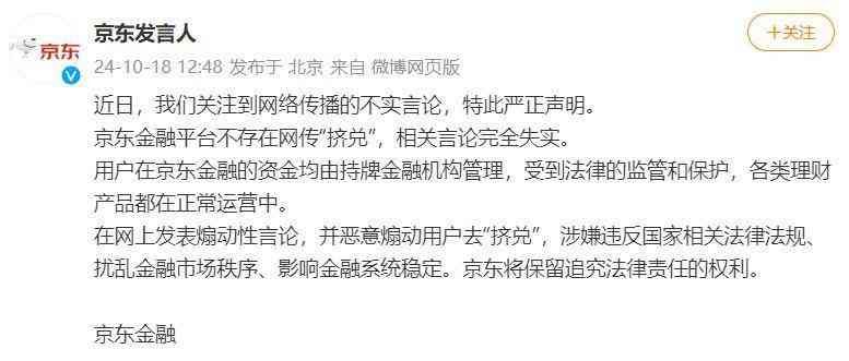 面对着铺天盖地的质疑和担忧,京东金融迅速做出了回应。京东发言人第一时间发文,态度坚决地否认了网传的“挤兑”传闻,并强调京东金融平台上的用户资金都是由持牌金融机构管理,受到法律监管和保护,所有理财产品都在正常运营,大家可以放心。