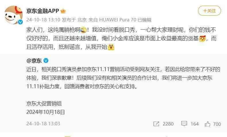 这边“挤兑”风波还没平息,那边京东又因为脱口秀演员的事情被推上了风口浪尖。原来,有网友对京东 11.11 营销活动邀请的某脱口秀演员表示不满,认为其言行存在争议,引发了广泛关注。