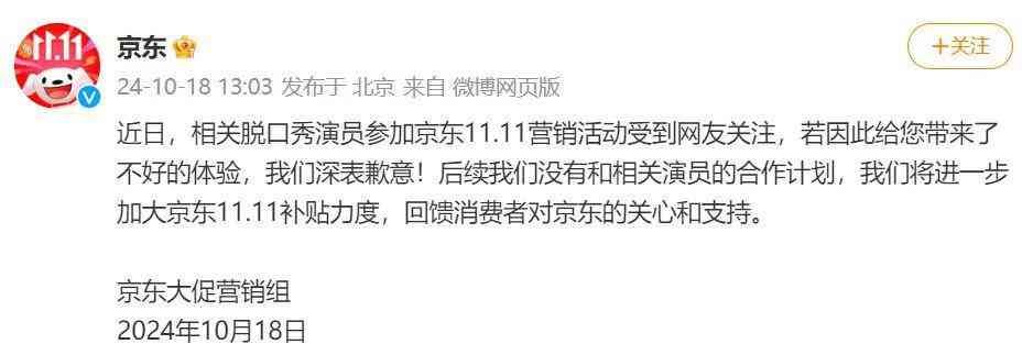 迫于压力,京东大促营销组不得不通过官方微博账号发布公告,为邀请该演员给用户带来的不好体验道歉,并表示以后将不再与其合作。