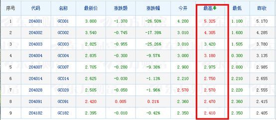 上图中为某个交易日国债逆回购的收益率情况,其中“最高”列中的就是各期国债逆回购当天的最高收益率。