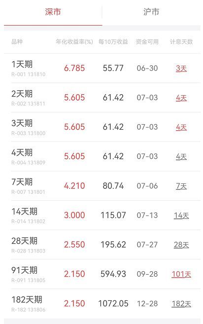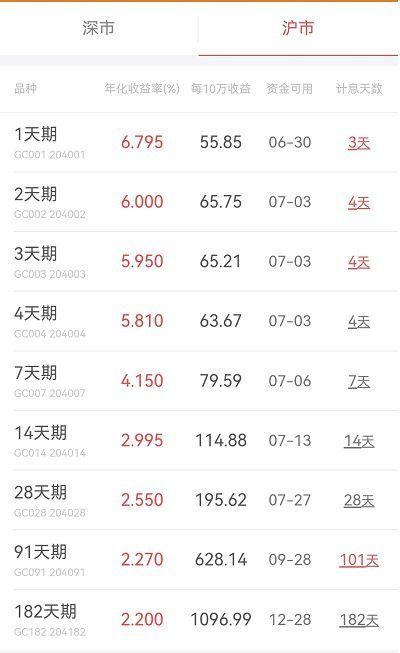 可以看到,当天沪深两市的14天期之前的国债逆回购,收益率明显要高不少,其中1天期的更是快要到6.8%了,而91天期和182天期的收益率才2%左右。