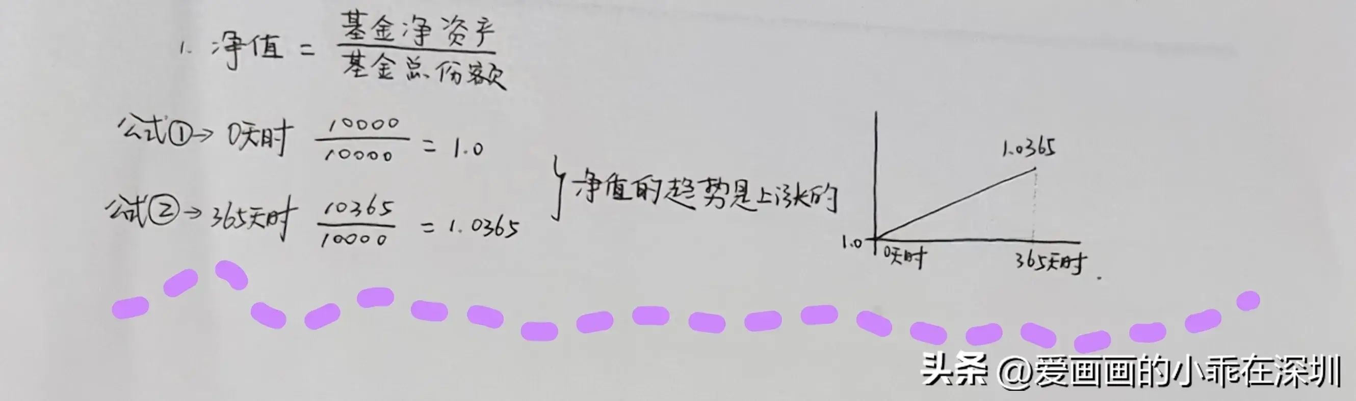 如果一年按365天算,一年后这个基金做生意赢钱了,资产变成了10365元。那按照公式2去算,得到的净值就是1.0365元每份。