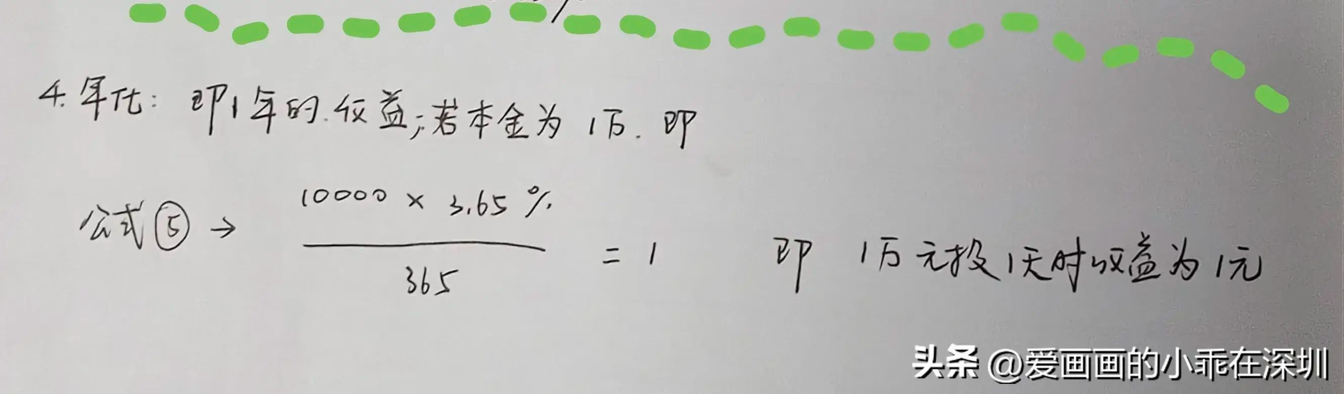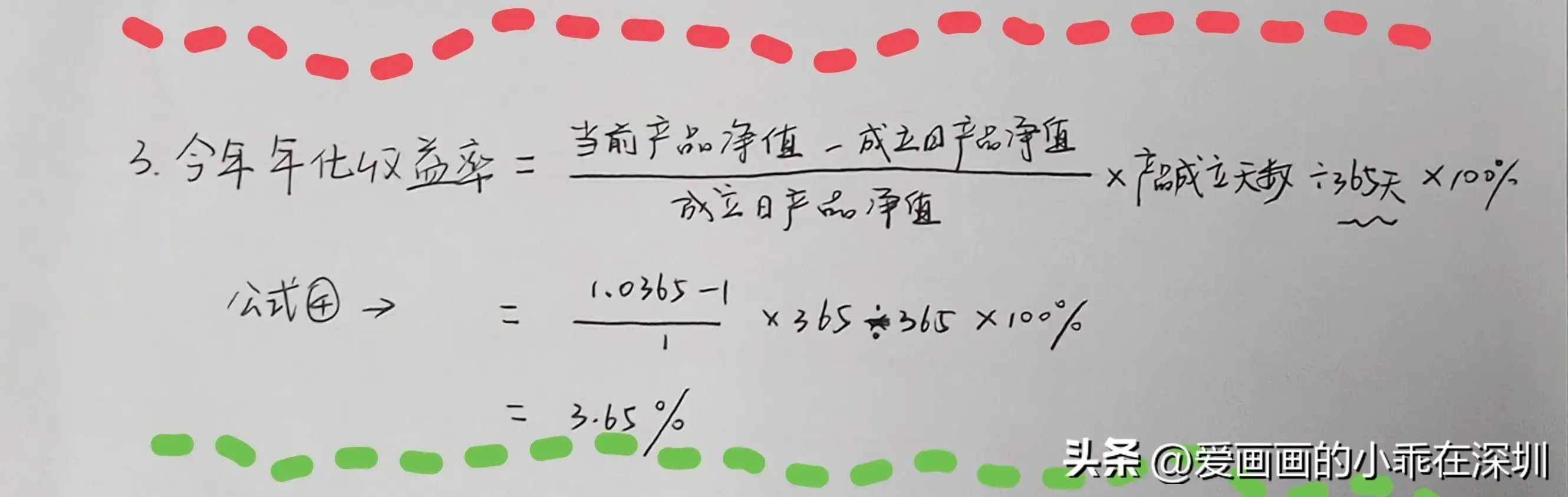 假设一个基金,年初成立时净值是1.,365天后就是年末,此时净值为1.0365,那就用它们的差值,0.0365乘以产品成立天数,再除以365,然后×1%,如公式4,就得到了今年年化收益率为3.65%