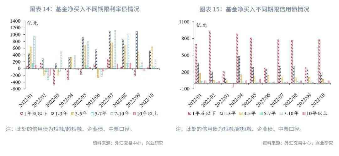 从基金二级市场行为来看,基金净买入利率债的期限较长,净买入信用债的期限较短。我们以基金净买入各期限利率债(信用债)的规模绝对值占净买入所有期限利率债(信用债)的规模绝对值总和的比重(简称“净买入规模占比”)来反映基金对不同期限利率债和信用债的净买入情况。以基金在2022年1-10月的净买入规模为例,在利率债方面,1-3年、3-5年、7-10年的利率债净买入规模占比分别为30.5%、23.8%、28.3%;在信用债方面,1年及以下、1-3年的信用债净买入规模占比分别为59.0%、24.9%。