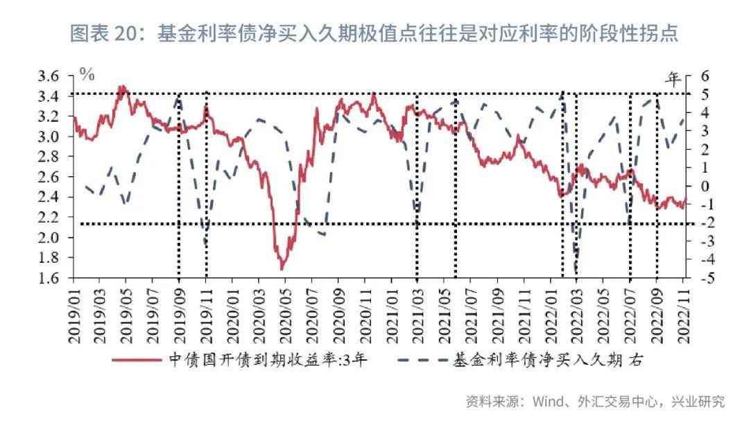 在净买入利率债久期方面,从图表20显示的结果来看,2019年以来基金净买入利率债久期主要位于-2年至5年的区间。当净买入利率债久期降至约-2年及以下,3年期国开债到期收益率往往达到或接近阶段性高点,未来国开债走势有较大概率下行,具体时间点包括2019年10月底、2021年2月底、2022年2月底、2022年6月底;当净买入利率债久期拉升至约5年及以上,3年期国开债到期收益率往往达到阶段性低点,未来国开债走势有较大概率上行,具体时间点包括2019年8月底、2021年5月底、2022年1月底、2022年8月底。