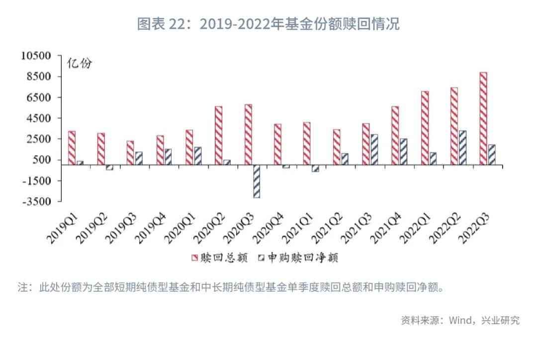 在净买入信用债久期方面,从图表21显示的结果来看,2019年以来基金净买入信用债久期普遍大于0年,当净买入信用债久期降至0年以下往往是基金公司赎回总额较高且申购赎回净额较小的时间段,这主要是由于信用债流动性较差,当基金开始以较大力度卖出信用债时往往是基金遭遇较大赎回压力的时候。基金净买入信用债久期明显低于0年的具体时间点包括2020年6月底、2020年7月底、2020年11月底、2021年1月底、2022年3月底,包含以上时间节点的季度为2020Q2、2020Q3、2020Q4、2021Q1、2022Q1。在这些季度,基金(短期纯债型基金和中长期纯债型基金)赎回总额相对较高,2020Q3、2020Q4、2021Q1三个季度基金申购赎回净额为负,2020Q2、2022Q1基金申购赎回净额也明显低于前两个季度。