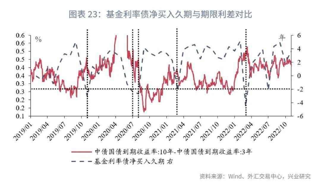 在净买入利率债久期方面,从图表23呈现的结果来看,当基金净买入利率债的久期降至-2年及以下,期限利差(中债10年国债到期收益率与中债3年国债到期收益率的差)往往到达或接近阶段性高点,未来期限利差走势大概率下行,具体时间点包括2019年10月底、2020年6月底、2020年7月底、2021年2月底、2022年2月底。
