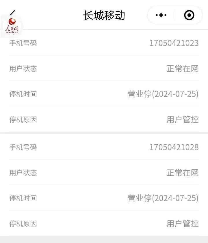 属于长城移动的,是2个“170”打头的手机号,号码归属地显示为辽宁沈阳。致电长城移动“143”服务热线询问得知,这两个手机号正是上述的“注册卡”,即只能用来收发平台的验证短信注册账号使用。公众号页面显示,两张卡已因为“用户管控”的原因于7月25日被停机。何为“用户管控”?长城移动客服称需要向售卡的代理商询问才能得知,但从两张卡内均有几毛钱余额来看,并非是因为欠费而停机。记者查询网络后得知,运营商“管控停机”可能的原因包括但不限于“手机使用行为异常、身份信息验证问题”等等。