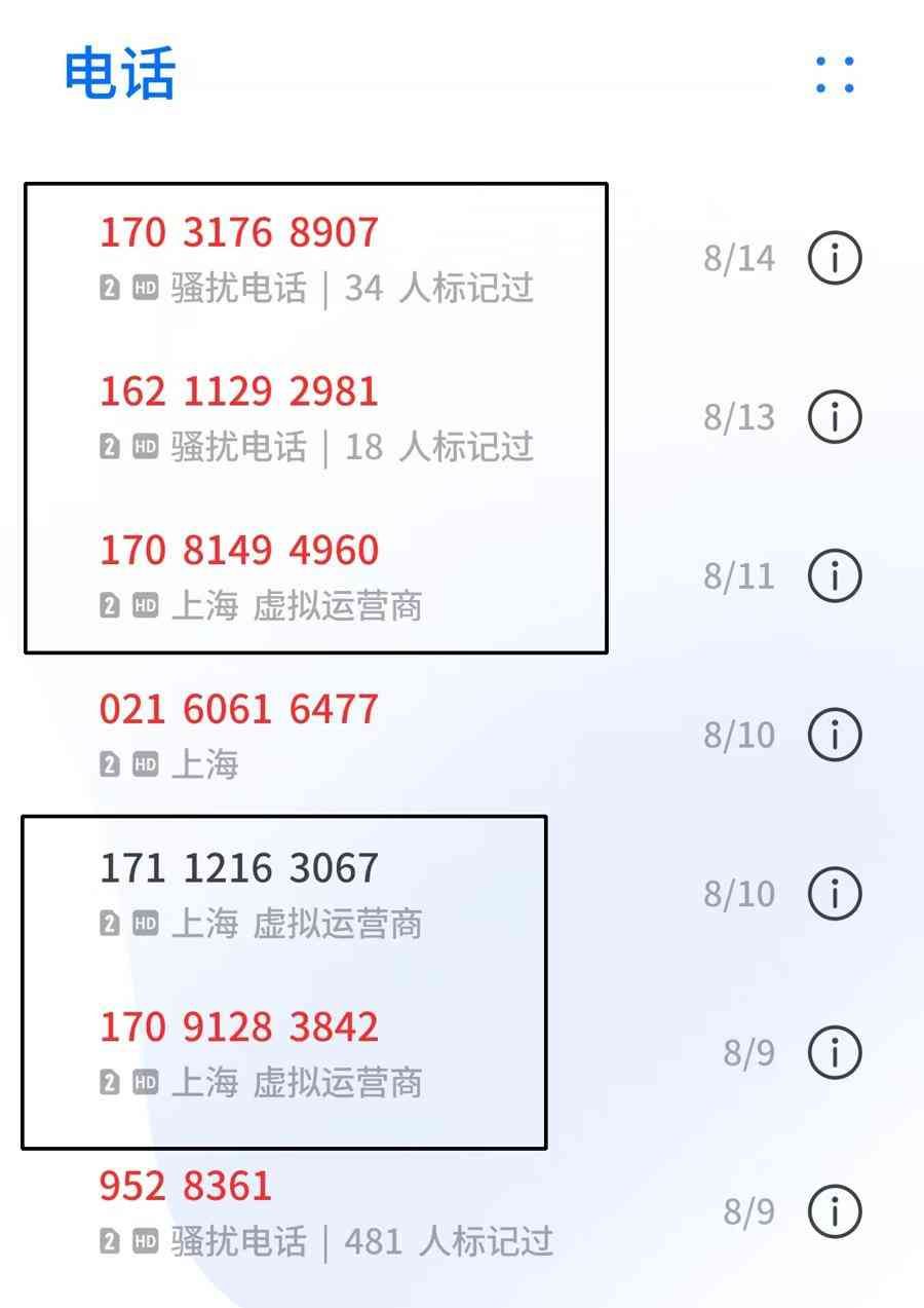 △虚拟运营商手机号已成骚扰电话的主要来源,图为记者收到的部分骚扰电话。