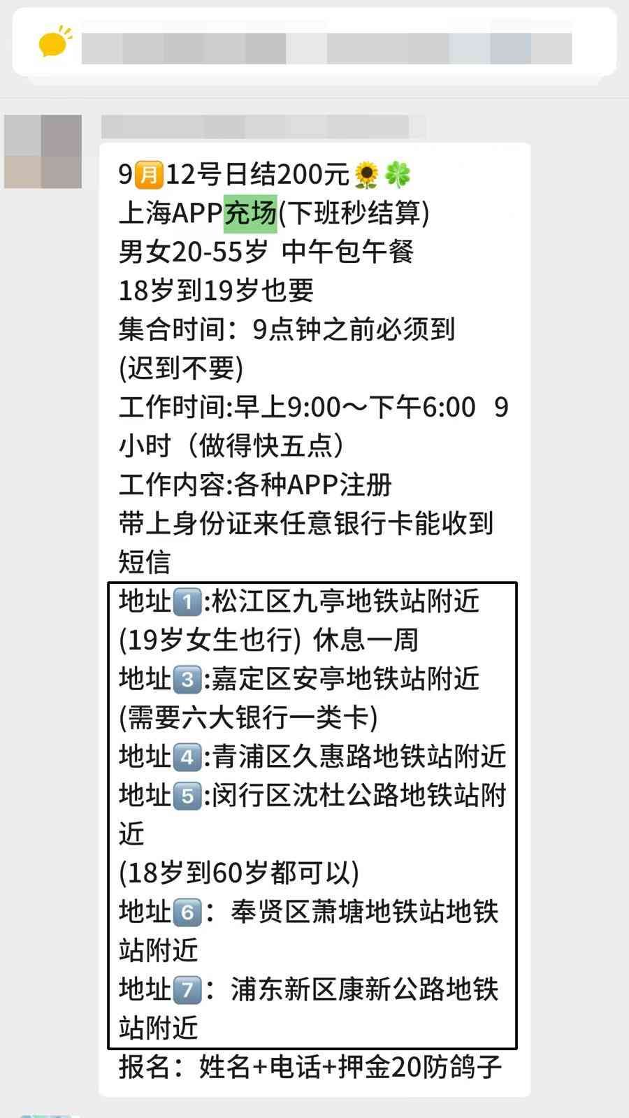 什么是“App充场”?循着李女士的线索,记者也加上了几名劳务中介的微信,他们会通过朋友圈发布各种“打零工”兼职信息,而“App充场”几乎是常驻项目。9月10日一早,劳务中介虞某发布了当天的“App充场”兼职信息,声称只要下载抖音、京东等知名App冲量即可,“工作简单轻松,有空调包午餐”,报酬是2元一天。记者支付押金报名后,被通知9月11日一早8时30分,在8号线沈杜公路站1号口集合。