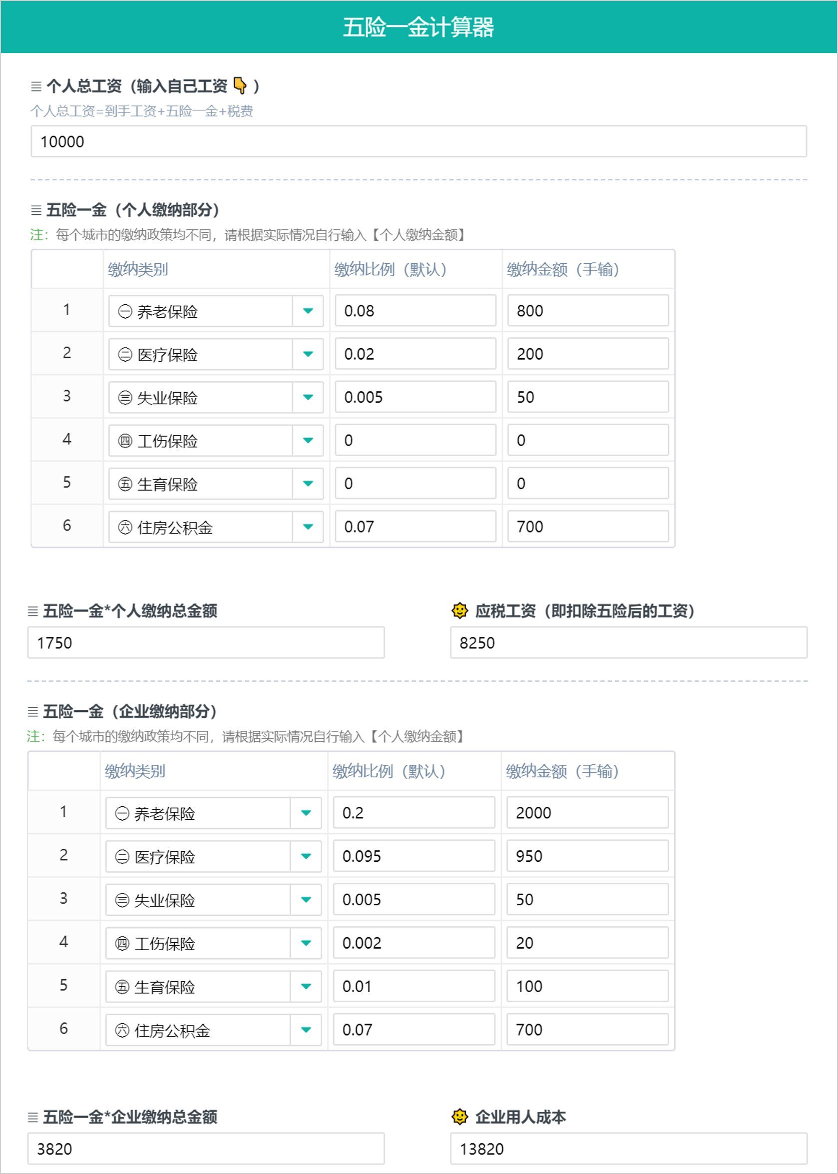2、每个城市、企业的五险一金缴纳政策均不同,请根据实际情况自行调整公式。