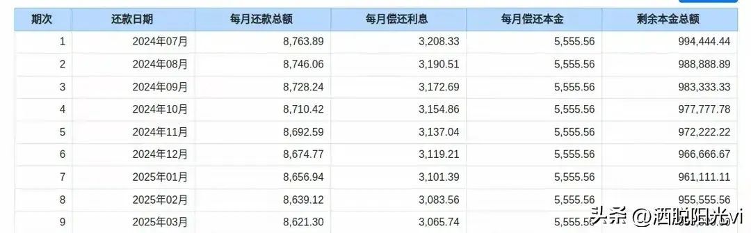 - **等额本金**:每月偿还的本金相同,利息随着剩余本金的减少而逐渐降低。所以,刚开始的还款压力比较大,但后期会减轻。