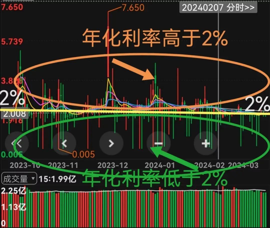 特别是节假日、年月末,有时利率甚至高达十几个点,这个时段的收益极其可观,可重点关注。