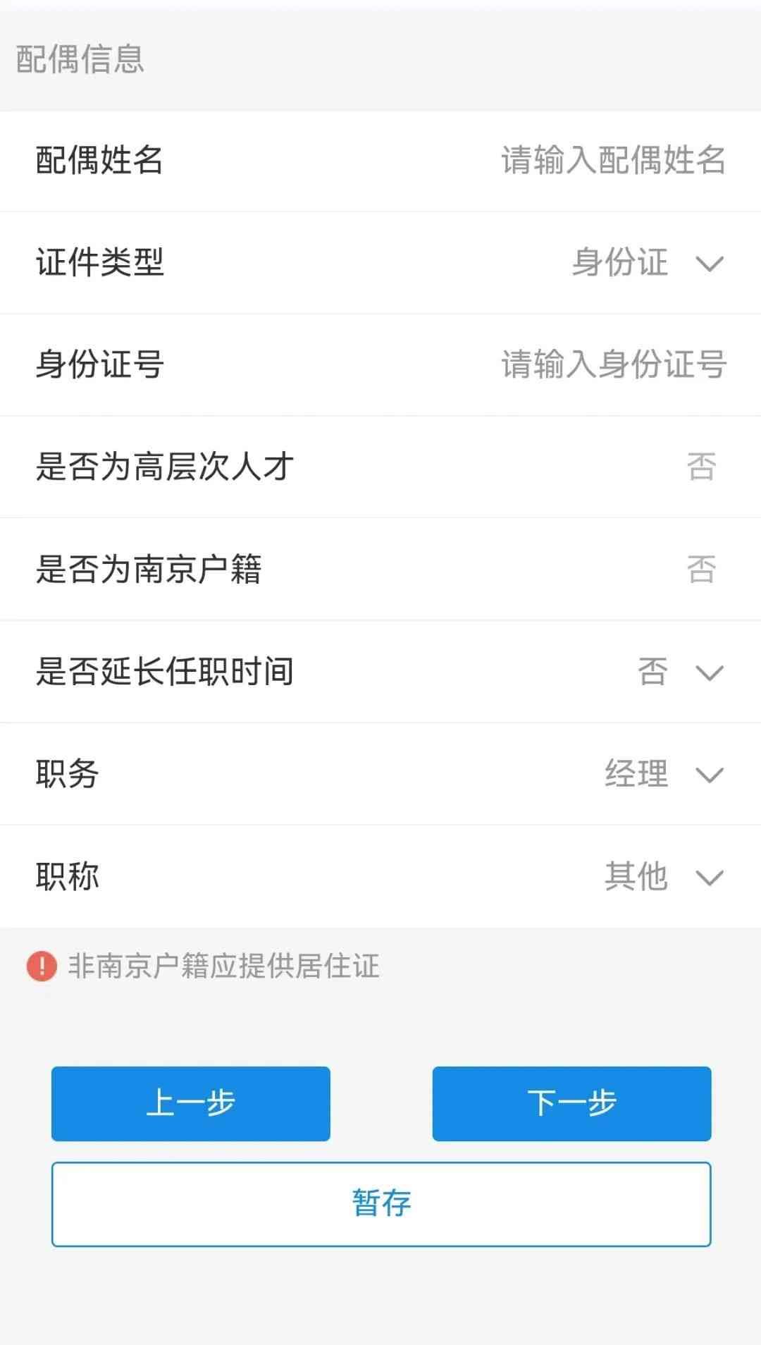 若您婚姻状况是已婚则进入配偶信息确认页面,输入您配偶姓名和证件号码,根据实际情况选择您配偶的职务、职称,确认无误后点击【下一步】。(若您婚姻状况是未婚,则该流程直接跳过)