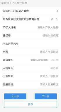 根据共享信息查询到家庭已有房产信息,选择已有房产套数是否包含此次贷款的房产并至少填写已有房产的坐落和建筑面积。房产信息确认无误后点击【下一步】。(若未查询到家庭现有房产,则该流程直接跳过)
