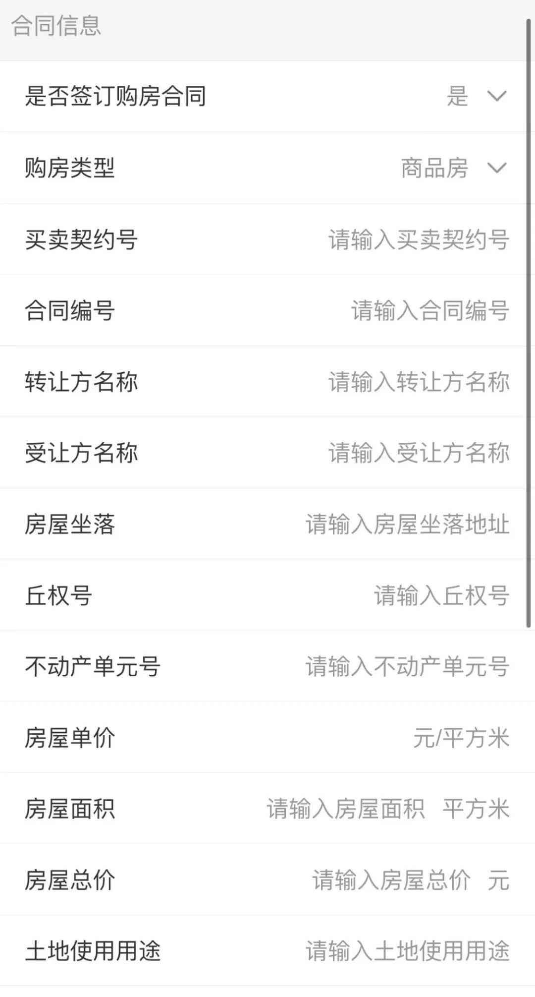根据购房情况选择是否已签订购房合同及购房类型,并至少填写所购房产或预购房产的房屋总价和房屋面积,确认无误后点击【下一步】。