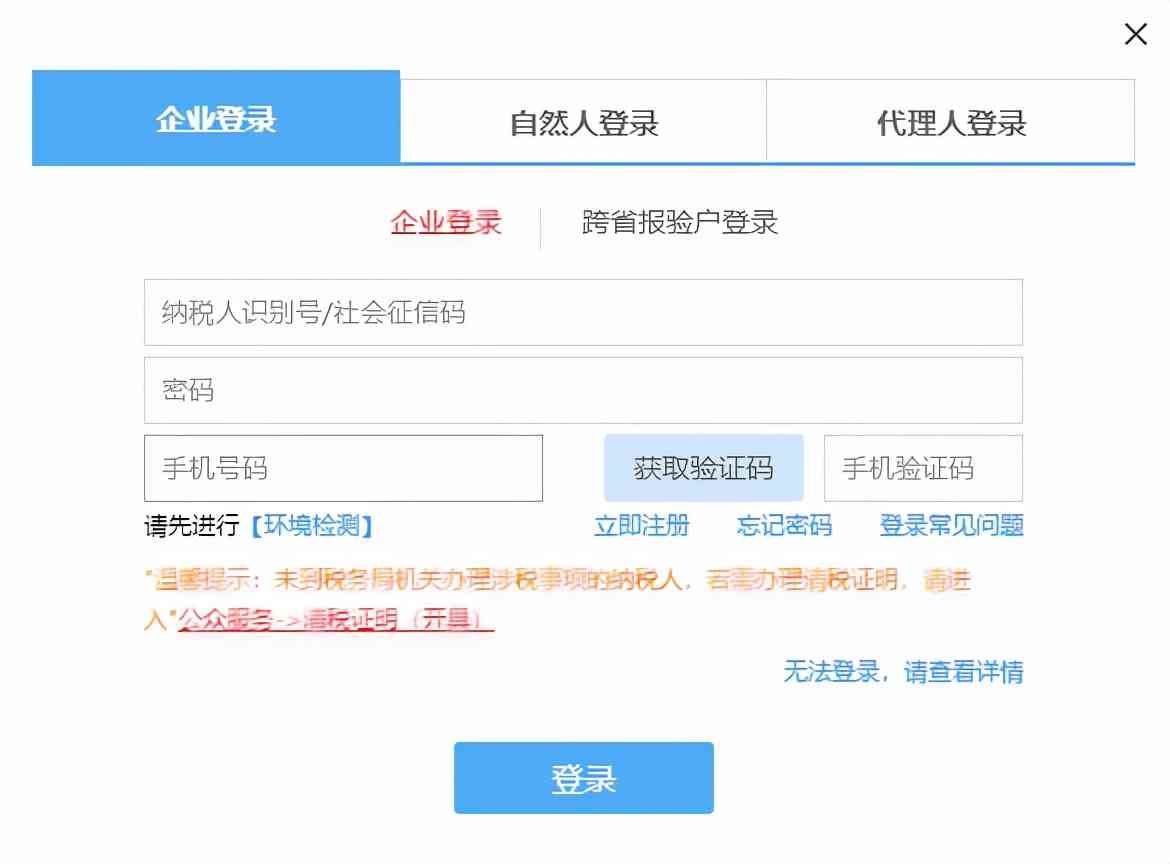2.点击右上角“登录”按钮,以“企业登录”的方式输入社会信用代码(或纳税人识别号)、密码、手机号码以及验证码后,登录进入电子税务局。