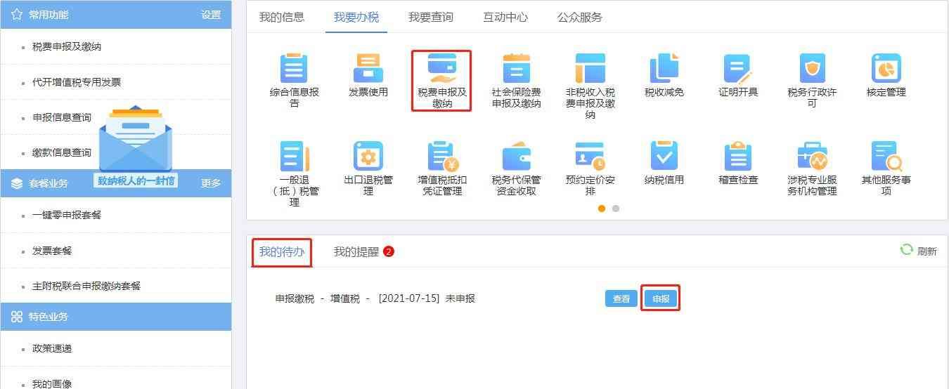 1.在首页屏幕下方查看“我的待办”,电子税务局会提示您当前未申报的税种及申报截止日期。点击待办区的“申报”按钮或“税费申报及缴纳”模块办理申报缴税业务。