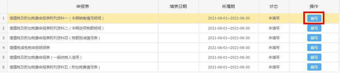 1.点击《增值税及附加税费申报表附列资料一(本期销售情况明细)》后面的“填写”。