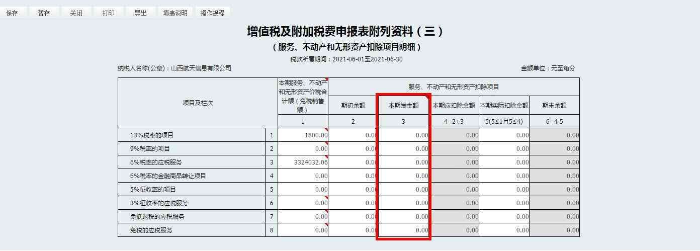 5. 在《增值税纳税申报表附列资料(三)》中,手工录入第3列“本期发生额”,其他各列由电子税务局自动生成,完成后点击左上角“保存”,返回《增值税纳税申报表附列资料(一)》。