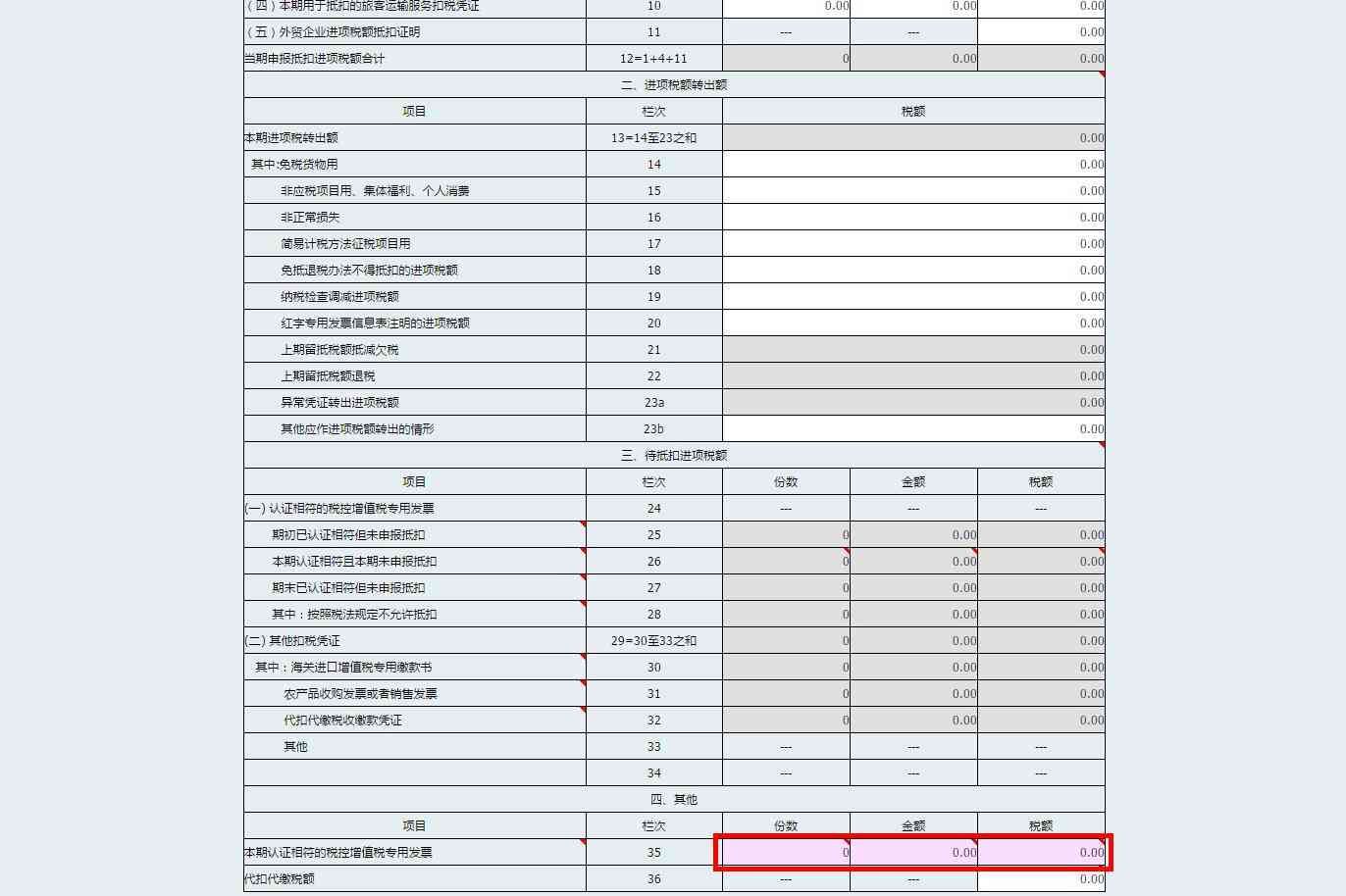 2.核实并修改电子税务局自动提取的第35栏“本期认证增值税专用发票”的“份数”“金额”“税额”栏次数据。