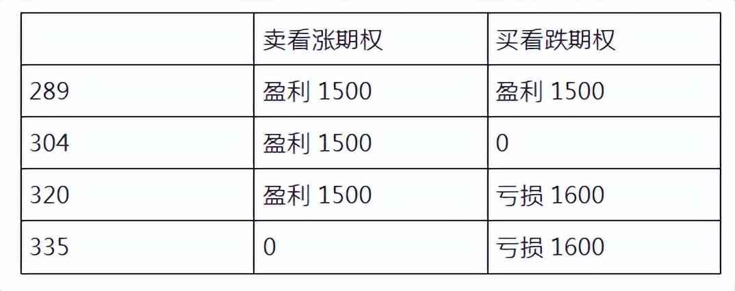 而对于买看跌期权,股价跌至304以下时,才开始盈利,股价为289以下时,买看跌期权的盈利开始超过卖看涨期权。股价不变时,也就是为320时,卖看涨期权的盈利15元,买看跌期权亏损16元。