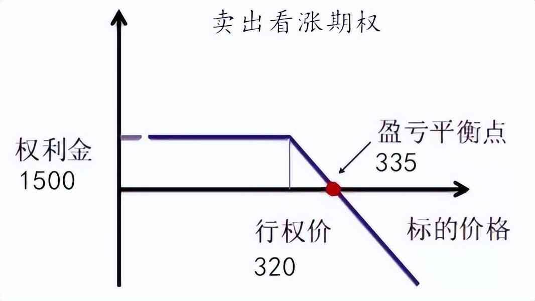 从下面的卖出看涨期权损益图中可以看到卖看涨期权是先获得一份15×1=15的权利金,当股价涨至335时,才到盈亏平衡点,当股价高于335时开始亏损,股价涨得越高,亏损是越多的,而卖出看涨期权的最大收益总为15元;