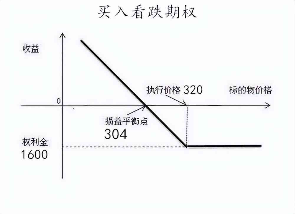 从下面的买入看跌期权损益图中可以看出,买看跌期权的买方是付出16元权利金,当股价跌至304时到达盈亏平衡点,股价跌到304以下时才开始获利,股价跌得越低,买入看跌期权的收益就越高,但买入看跌期权的亏损是有限的,最大亏损总是为16元。